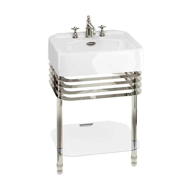 This beautifully designed 600mm basin is mounted on a nickel plated steel stand which has a useful integrated glass shelf to store towels or toiletries, available in a choice of 0, 1, 2 or 3 tap holes, this gives the versatile option of pairing it with many of the stunning Arcade taps on offer. Arcade use a unique PVD nickel-finish coating which offers a long lasting finish and is also environmentally friendly.
