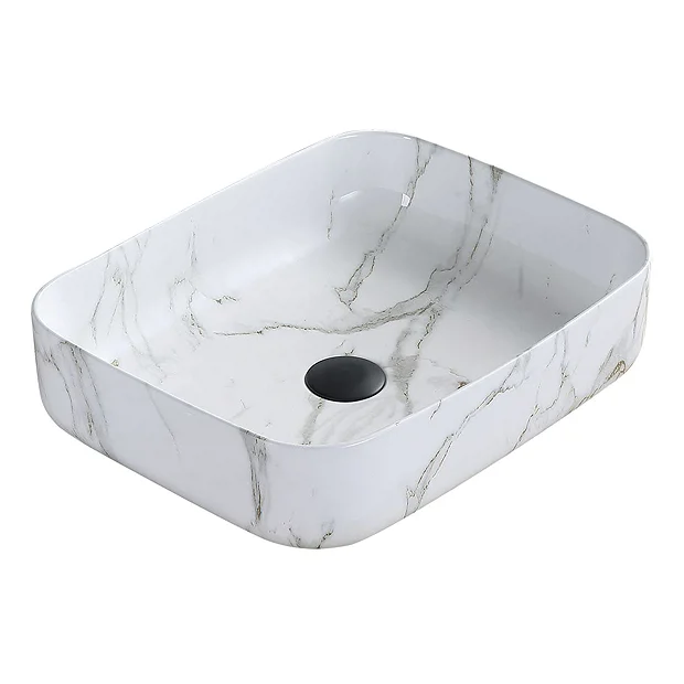 The eye catching luxury Arezzo gloss black marble effect counter top basin has a stylish contemporary curved shape, perfect for creating a boutique feel in your bathroom. Designed to be mounted onto a worktop console and is best complemented with a high rise basin mixer or wall mounted tap. Manufactured from high quality vitreous china with a painted gloss white marble effect finish. Some small dimensional variation may occur due to manufacturing tolerances. Waste not included.