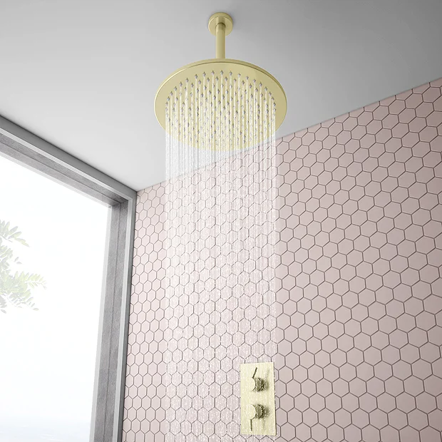 This Arezzo brushed brass concealed thermostatic valve will compliment any modern bathroom suite, offers thermostatic showering via two easy-to-operate controls for temperature and flow. Supplied with a large 300mm round shower head with ceiling mounted arm, it’s minimalist design looks great in any setting. Our range of Showers are ideal for renewing the style of your bathroom affordably.