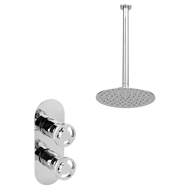 This Arezzo chrome industrial-style round concealed thermostatic valve features a stripped-down aesthetic with round knurled textured tap heads, perfect for creating an eye catching industrial look in your bathroom. Offers thermostatic showering via two easy-to-operate controls for temperature and flow. The valve body comes with a contemporary curved face plate and has been constructed from solid brass. Supplied with matching ceiling mounted polished chrome round fixed shower head with swivel joint and arm.