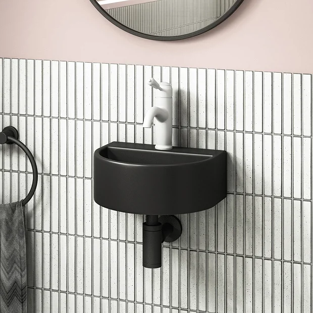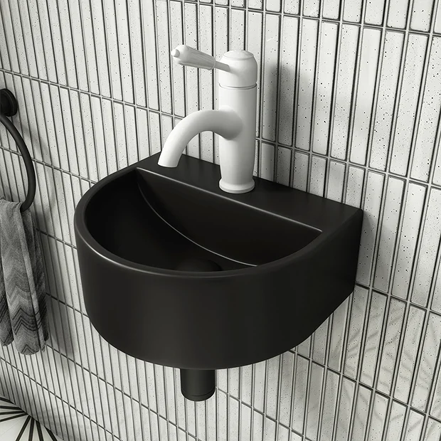 The stylish Arezzo round wall hung cloakroom basin, a high quality curved ceramic basin with a single tap hole and stunning matt black finish. Provides you with a handy wall mounted space-saving solution for your cloakroom or en-suite. Some small dimensional variations may occur due to manufacturing tolerances. Waste not included. Complete the look with one of our stunning exposed bottle traps.