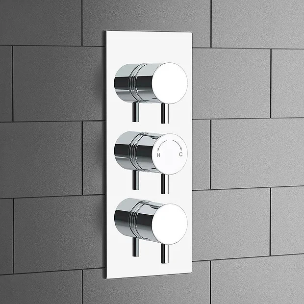 The stylish concealed thermostatic triple shower valve offers thermostatic showering via three easy-to-operate controls. The diverter allows you to switch between three different outlets.