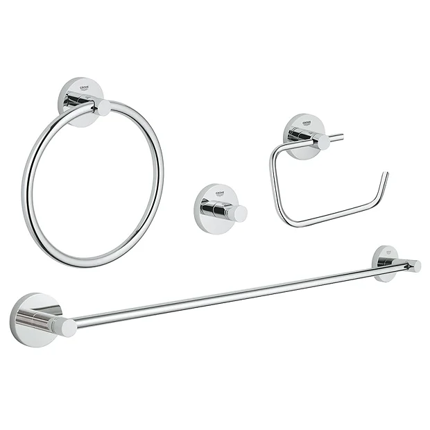 The Grohe Essentials 4-Piece Bathroom Accessories Set provides the ideal finishing touch to your bathroom. Consisting of towel ring, 600mm towel rail, robe hook and toilet paper holder. In a dazzling, durable GROHE StarLight chrome finish, this set has everything you need to complement your bathroom scheme.