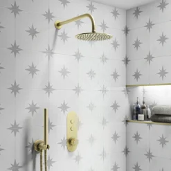 Arezzo Brushed Brass Round Shower System (Fixed Head, Handset + Integrated Parking Bracket)