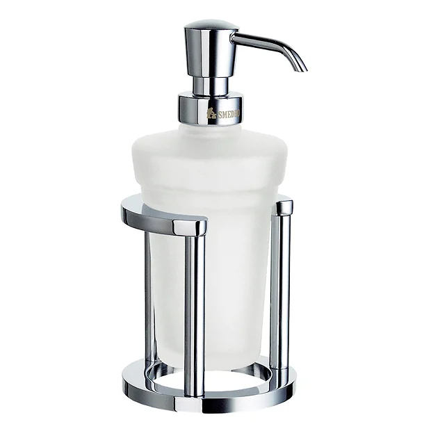 This soap dispenser is from the Outline range which features freestanding accessories that can be used on their own or as the perfect accompaniment to other Smedbo ranges. The holder is constructed with a solid brass core and copper-zinc alloy which is rust resistant and beautifully finished in a durable polished chrome coating. The frosted glass soap dispenser can be detached for easy cleaning.