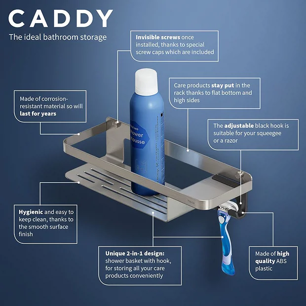 The Tiger Caddy Shower Basket with Hook is timeless, unique and multifunctional. In addition to your shower gel and shampoo, this 2-in-1 design also offers space for your razor, towel or squeegee. This way you can store everything neatly and always have your things within reach.