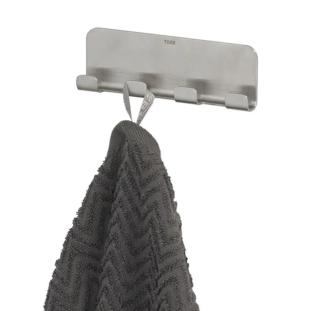 This multi towel hook from the Tiger Colar range is stylish and completely on-trend. It can be mounted in its entirety with the supplied strong, double-sided 3M tape. Manufactured from quality stainless steel with a Brushed finish.