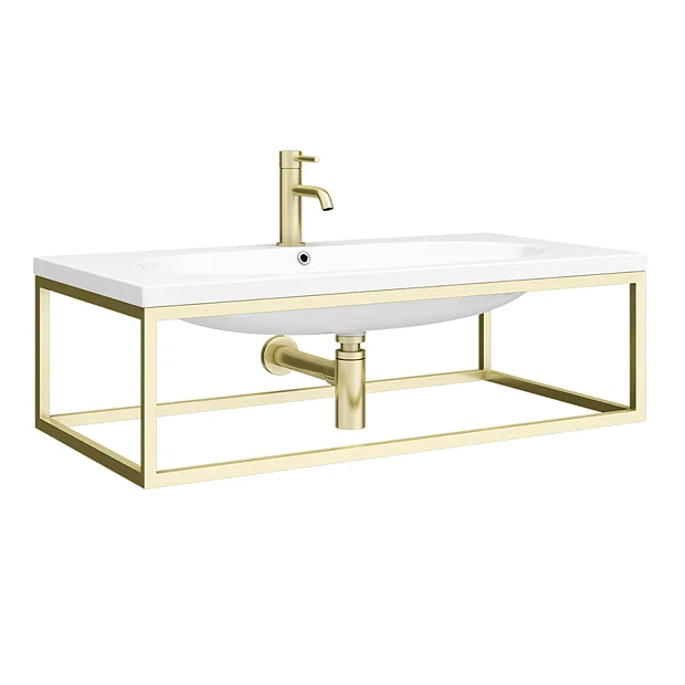 Venice 900 Wall Hung Basin with Brushed Brass Towel Rail Frame inc. Tap + Bottle Trap